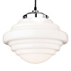 Our Decorative Pendant Light is a true work of art, reminiscent of the opulent 1930s when Art Deco design reigned supreme. The polished chrome finish and the renowned milky white glass shade create a visual masterpiece that's more than just a source of light; it's a symbol of sophistication and style, capturing the essence of a bygone era.