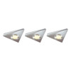 A pack of 3x NxtGen Georgia Premium triangular-shaped LED under cabinet lights with 1.8W integrated LED light sources and 3000K warm white coloured light output.